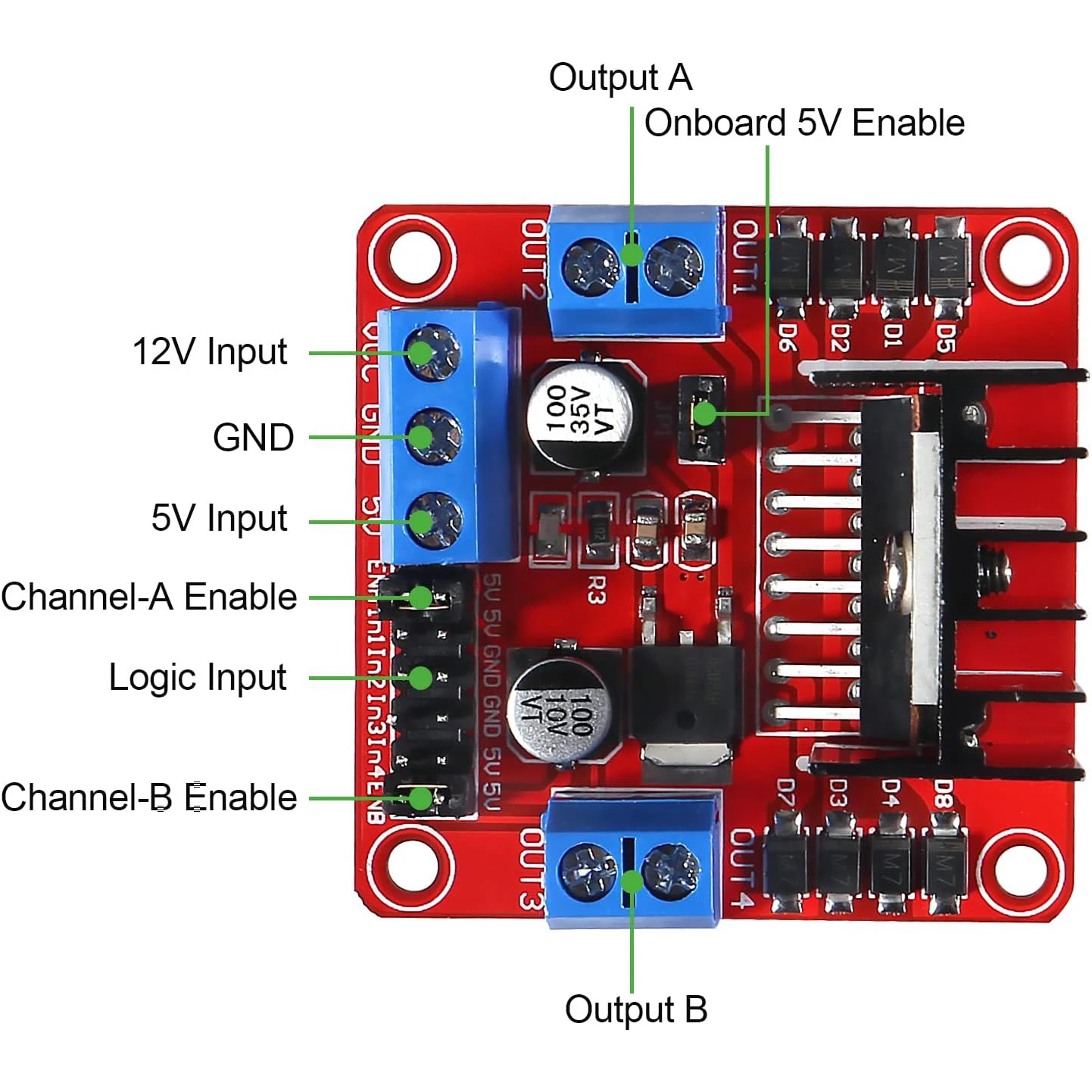 • Working voltage: 5V-35V, with a continuous current of 2A and a maximum current of 3A.